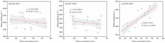 Relationship between cumulative water consumption (mm) and grain yield (kg ha−1) during winter wheat growing seasons of 2016–2017 (a), 2017–2018 (b), and 2018–2019 (c). Pearson correlation analysis was used for each year to determine relationships. The gray areas are the confidence interval (at 95% level) of the linear functions. ** indicates a highly significant relationship (p < 0.01).