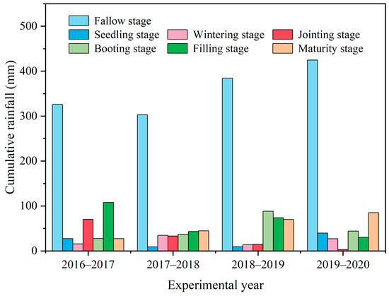 The distribution of annual precipitation during the fallow stage and various wheat growing stages, respectively, during the four experimental years.