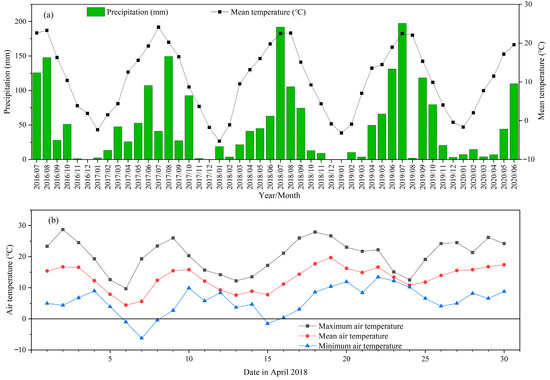 The precipitation (mm) and temperature (°C) during the experimental period in the experimental area: (a) shows the monthly cumulative precipitation and mean temperature from July 2016 to June 2020; (b) shows the daily air temperature in April 2018 in which extreme weather (frost) occurred.