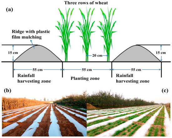 Schematic of the ridge–furrow with the plastic film mulching system (a), and with the field performance at the seedbed preparation stage (b) and seedling stage (c) of winter wheat (cultivar: Changhan 58).