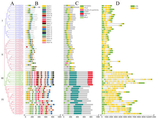 ZmHD-ZIP family gene and protein structure. (A) Phylogenetic tree; (B) motif analysis; (C) conserved domain analysis; (D) gene structure.