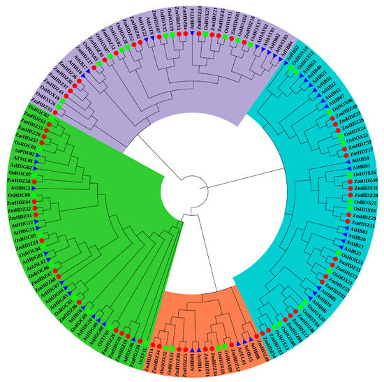 Analysis of the evolutionary relationship of HD-ZIP genes in maize, rice, and Arabidopsis. Blue represents the HD-ZIP I subfamily; purple represents the HD-ZIP II subfamily; red represents the HD-ZIP III subfamily; green represents the HD-ZIP IV subfamily. The red circles represent HD-ZIP members in maize; the blue triangles represent HD-ZIP members in Arabidopsis; the green squares represent HD-ZIP members in rice.