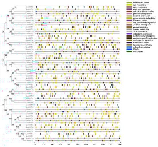 Analysis of cis-acting regulatory elements in ZmHD-ZIP genes. The key cis-acting regulatory elements are distributed in the 2000 bp region upstream of the ZmHD-ZIP genes, and different elements are shown in different colors.