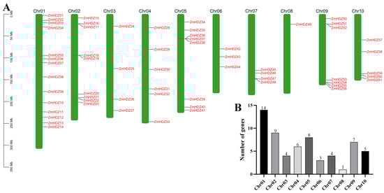 The location of the ZmHD-ZIP genes on chromosomes. (A) Distribution of the ZmHD-ZIP genes on chromosomes; (B) the number of ZmHD-ZIP genes on each chromosome.
