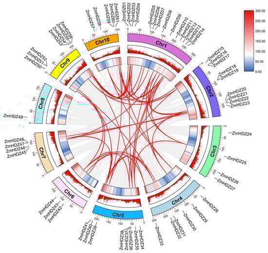 Collinearity analysis of the ZmHD-ZIP genes. Heat maps and histograms along the rectangles represent gene densities on chromosomes. Gray lines indicate syntenic blocks in the maize genome, and red lines between chromosomes indicate gene pairs with segmental duplications.
