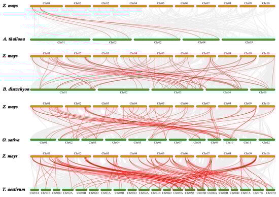 Additionally, we explored the collinearity relationships of ZmHD-ZIP genes in four representative species, including the dicotyledonous Arabidopsis and three monocots—rice, wheat, and Brachypodium distachyon L.—to identify orthologous genes. The results showed 5 pairs of orthologous genes between maize and Arabidopsis, 60 pairs between maize and Brachypodium distachyon L., 55 pairs between maize and rice, and 124 pairs between maize and wheat (Figure 6). These results suggest that maize has a closer phylogenetic relationship with wheat.