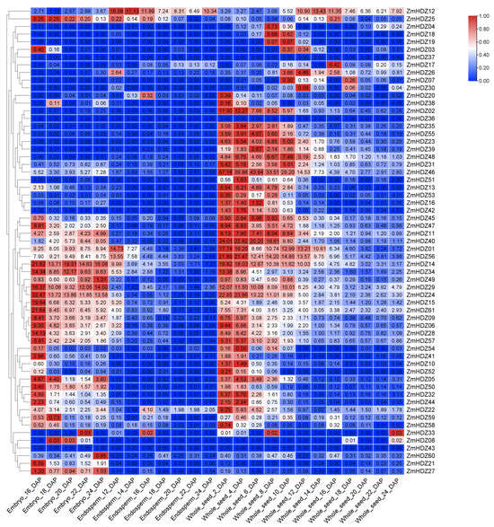 ZmHD-ZIP genes expressed in different seed parts in different periods. The transverse axis represents different seed parts in different periods, and the longitudinal axis represents the ZmHD-ZIP genes.