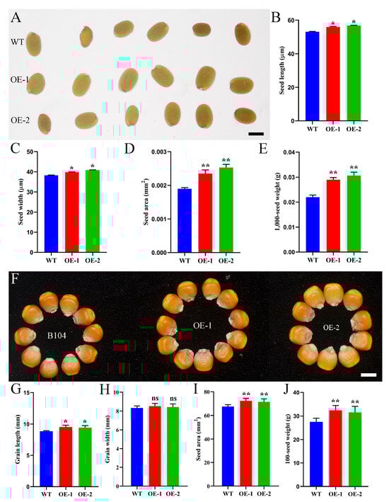 ZmHD-ZIP23 positively regulates seed size. (A) Seeds of WT line, ZmHD-ZIP23-overexpressing line 1 (OE-1), and ZmHD-ZIP23-overexpressing line 2 (OE-2) of Arabidopsis. (B–E). Statistical data on seed length (B), seed width (C), seed area (D), and 1000-seed weight (E) of WT, OE-1, and OE-2 Arabidopsis plants. (F) Grains of B104 line, ZmHD-ZIP23-overexpressing line 1 (OE-1), and ZmHD-ZIP23-overexpressing line 2 (OE-2) of maize. (G–J) Statistical data for grain length (G), grain width (H), seed area (I), and 100-seed weight (J) for B104, OE-1, and OE-2 maize plants. The expression level of ZmHD-ZIP23 in OE-1 and OE-2 was higher than the WT (Figure S1).The data represent the mean ± SD of three biological repeats, and the asterisks represent significant differences among groups (* p < 0.05, ** p < 0.01); ns, no significant differences. Bars, 40 µm (A), 0.5 cm (F).