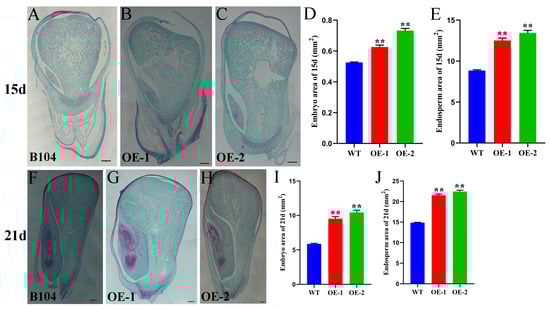 The seed size depends on the size of the embryo and endosperm. In order to investigate the size of embryo and endosperm during the development of ZmHD-ZIP23-overexpressing maize, samples were taken from seeds at 15 and 21 days after pollination, and paraffin sections were prepared. Microscopic observation revealed that the embryo and endosperm areas of OE-1 and OE-2 were significantly larger than those of B104 at both 15 and 21 d (Figure 9). This indicates that during seed development, the seeds of ZmHD-ZIP23-overexpressing maize developed faster than those of B104 maize, had larger embryo and endosperm, and might accumulate more nutrients at the same time, which is of great significance for increasing maize seed yield.