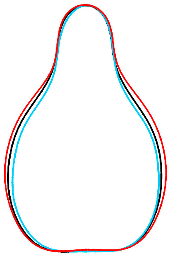 The Regina model (black) is the average outline of the seeds of Regina dei Vigneti (red) and Muscat Hamburg (light blue).
