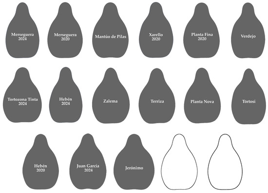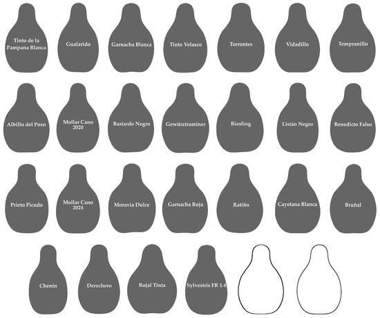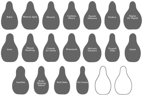 From their analysis of a large number of representative genomes, Dong et al. described Regina dei Vigneti and Muscat Hamburg as the most popular parental cultivars with a pure ancestry for one of the original genotypes in the basis of V. vinifera cultivars [25]. In consequence, a new model formed by the average silhouette of both cultivars was developed (Figure 1) to identify other cultivars associated with this group.