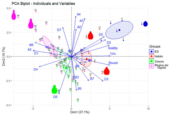 PCA with the values of solidity, aspect ratio, circularity, roundness, and 19 Fourier coefficients (a2 to a7, b2 to b7, d1 to d7) showed differences between groups for all the binary combinations in Dim1 (PC1). In Dim2 (PC2), there were differences for all combinations except two (EG vs. Regina and Hebén vs. Chenin) (Figure 5). Figure 5 also shows the relation between the Fourier coefficients and geometric measurements. Aspect ratio (AR) and roundness (opposite to it) are related to Dim1, in association with coefficients A3, D1, D2, D3, D4, and D5. Dim2 grouped the coefficients A2, A4, B3, and B5.