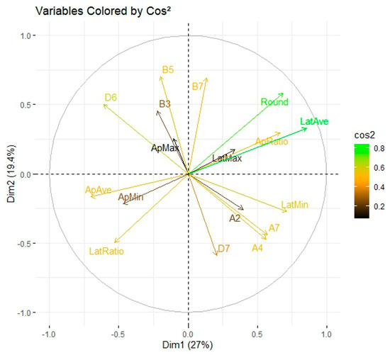 Correlation circle plot or variable factor map. In addition to roundness, curvature measurements appear to be related to the coefficients. The max-to-average curvature ratio (lateral) is opposed to roundness, while the max-to-average curvature ratio (apical) is closer to solidity. Average curvature (apical) is opposed to curvature ratio (apical). Maximum apical curvature is positively associated with B3, B5, B7, and D6 and negatively with D7. Minimum lateral curvature is positively associated with A2, A4, and A7 and negatively with D6.