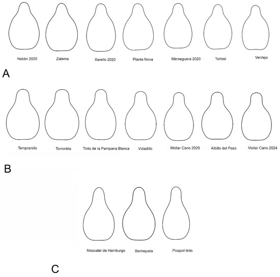 Table 3 shows the cultivars corresponding to the points within a region defined by a 10% confidence interval or ellipse around each cluster’s centroid (Figure 5). The corresponding outlines are represented in Figure 7 (Hebén in upper line, A; Chenin in middle line, B; and Regina in bottom line, C), showing that solidity is highest in the Hebén group, and aspect ratio in Regina. In contrast to the compact, almost triangular form of the outlines in the Hebén group, a more prominent stalk is observed in the Chenin and Regina groups, being the cause of lower solidity in them. The stalk determines the region of maximum curvature at the apex (ApexMax), which is highest in Regina, as well as a region of negative curvature in the lateral side of the seeds (LatMin), whose absolute values are higher in the Chenin group. The difference between the Chenin and Regina groups lies in the shape of the stalk—more elongated and acute in Regina, rounded at the apex and with two parallel sides in Chenin—resulting in lower circularity and roundness in Regina than in the other two groups. In summary, while maximum apical curvature (ApexMax) is higher in Regina, minimum lateral curvature (LatMin) is higher (absolute value) in Chenin than in the other groups.