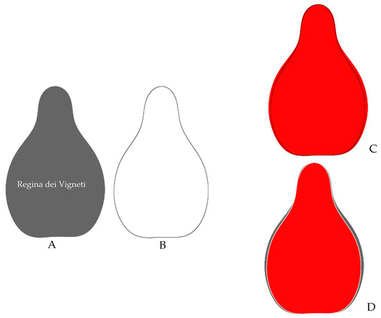 Schematic representation of the method to calculate J-index (percent of similarity of a set of images with a model). The model (average silhouette of Hebén, (B)) is superimposed here to an outline of Regina dei Vigneti (A), searching the maximum surface shared between the image and the model. In the right, above, the superimposed model is in black (C), and below, in white (D). When the images on the left are opened in ImageJ (right, red), the image on top (C) shows the total number of pixels in the figure (corresponding to the surface occupied by the red color), while the image below (D), shortened by the white line corresponding to the profile of the model, shows the shared surface (also in red). The number of pixels shared by the image and the model is lower or equal to the total.