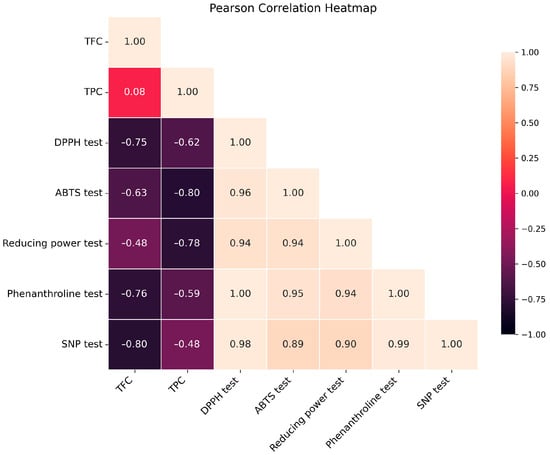 Pearson’s correlation heatmap between antioxidant parameters and TPC/TFC of n-BuOH extract.