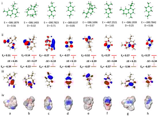 (i) Computed molecular geometry; (ii) LUMO; (iii) HOMO; and (iv) ESP of: (a) γ-cadinene; (b) β-caryophyllene; (c) limonene; (d) p-cymene; (e) copaene; (f) terpinen-4-ol; (g) δ-cadinene; and (h) γ-terpinene at B3LYP/6-311G (d,p) level.
