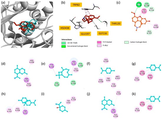 Superimposition of all compounds and the reference inhibitor, galantamine (Figure 5a), revealed overlapping binding modes, suggesting that EO components may act through mechanisms similar to known inhibitors. Two-dimensional interaction maps (Figure 5c–k) further illustrate the involvement of critical active site residues, in particular TRP82 and HSD438, which are essential for BuChE activity [56].