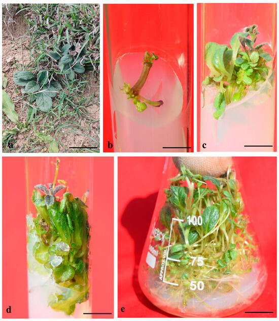 Establishment of A. bracteosa culture through internodes. Mother plant (a), internodal segment at MS + BA 5 µM—1-week-old culture (bar: 1 cm = 0.6 cm) (b), shoot regeneration on MS + BA 5 µM—4-weeks-old culture (bar: 1 cm = 0.96 cm) (c), shoot elongation on MS + BA 5 µM + IAA 1.5 µM—4-weeks-old culture (bar: 1 cm = 1.13 cm) (d), multiplication and proliferation of shoots on MS + BA 5 µM + IAA 1.5 + ADS 15 µM—4-weeks-old culture (bar: 1 cm = 1.38 cm) (e).