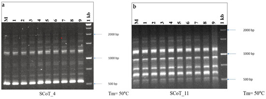 - Gorji, A.M.; Poczai, P.; Polgar, Z.; Taller, J. Efficiency of arbitrarily amplified dominant markers (SCoT, ISSR and RAPD) for diagnostic fingerprinting in tetraploid potato. Am. J. Potato Res. 2011, 88, 226–237. [Google Scholar] [CrossRef]