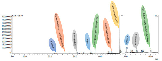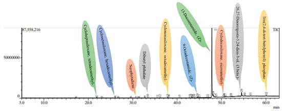A GC-MS chromatogram of the methanolic leaf extract of a 4-week-old in vitro-derived plantlet of A. bracteosa.