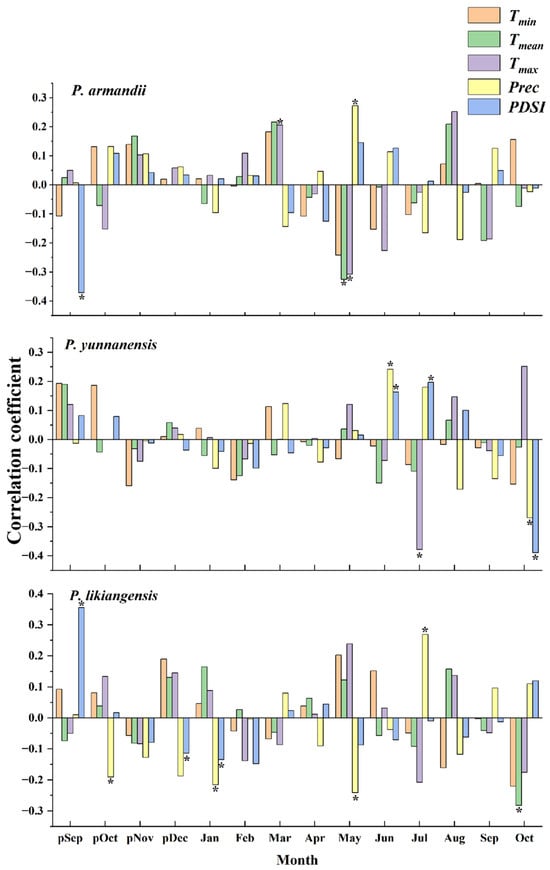 Based on the response function analysis between the residual chronologies and climatic factors (Figure 1), the three conifer species responded quite differently to climate. Specifically, P. armandii showed a significant and positive correlation with the March Tmax and May precipitation (Prec) in the current year and displayed a significant and negative correlation with the PDSI in previous September, as well as with the average temperature (Tmean) and Tmax in current May. P. yunnanensis exhibited a significant and positive correlation with precipitation and the PDSI in current June, as well as with the PDSI in current July, whereas its radial growth was negatively associated with the current July Tmax and with precipitation and the PDSI in current October. For P. likiangensis, significant and positive correlations were found with the PDSI in previous September and with precipitation in current July, whereas significantly negative associations were detected with precipitation in previous October, current January and May, with the PDSI in previous December and current January, and with the Tmean in current October.