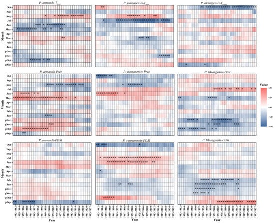 The results of 30-year moving window analysis (Figure 2) revealed interspecific differences in climatic responses. For P. armandii, the significance of negative correlations with the Tmax in current May and June mainly occurred before 2008, which corresponded to positive correlations with precipitation in current May and June. P. yunnanensis exhibited a gradual strengthening in the significance of its correlation with the current July Tmax, corresponding to the period of significant years of summer (June–July) of the PDSI. For P. likiangensis, the radial growth of negative associations with the Tmean in current October was quite stable between 1964 and 2022. The positive impacts of July precipitation on growth were more obvious from 1971 onward by showing more significant years. Significant correlations between growth and the winter (previous November to current February) PDSI were mainly observed between 1961 and 2013.