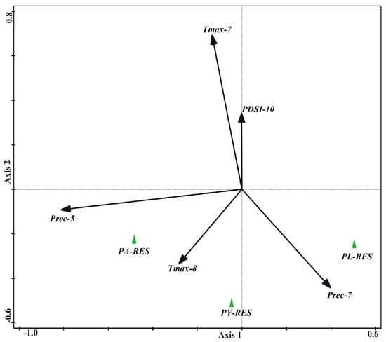 Redundancy analysis of residual chronologies with climate factors. Only significantly correlated climate factors were selected. The longer the vector of climate factors, the higher the contribution, the shorter the vertical line between the chronological point and the vector (itself or the extension line), and the higher the correlation between the two. The same direction of the two indicates a positive correlation, while the opposite is a negative correlation. PA-RES: residual chronology of P. armandii. PY-RES: residual chronology of P. yunnanensis. PL-RES: residual chronology of P. likiangensis.