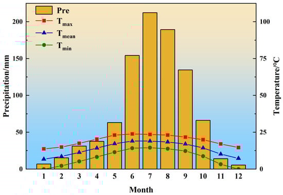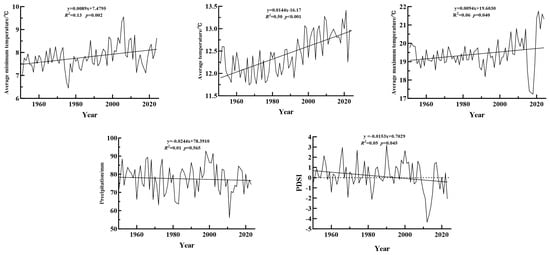 For this study, the meteorological data were sourced from the National Oceanic and Atmospheric Administration (NOAA). Two meteorological factors, namely the Tmin and Tmax from 1950 to 2023, were downloaded from the NOAA Lijiang Meteorological Station (100.22° E, 26.85° N, altitude 2380 m), which is the closest station to the sampling sites. According to the meteorological data from 1950 to 2023 (Figure 4), the annual Tmean is 13.6 °C. The warmest month is July with a temperature of 18.9 °C, and the coldest month is January with a temperature of 2.55 °C. The temperature shows an upward trend over time (Figure 6), with the Tmax, Tmean, and Tmin in Lijiang all rising to varying degrees. Among them, the Tmax has been increasing at the fastest pace annually, while the Tmean is rising at a relatively slower rate (Figure 6). The precipitation and the Tmean data were obtained from the Climatic Research Unit (CRUTSv.4.07; https://crudata.uea.ac.uk/cru/data/hrg, accessed on 20 April 2023), with a spatial resolution of 0.5° × 0.5°. The annual total precipitation is 930 mm, and precipitation is concentrated from June to September, accounting for 74.2% of the total precipitation, with the highest precipitation in July (Figure 4). The annual total precipitation shows a decreasing trend over time, but the reduction is not significant (Figure 6). The PDSI data were retrieved from the monthly dataset compiled by the global CRU grid (https://crudata.uea.ac.uk/cru/data/drought, accessed on 20 April 2023), with a resolution of 0.5° × 0.5°. The PDSI, a comprehensive meteorological drought indicator that combines precipitation, evapotranspiration, and drought duration, is widely used in drought assessment []. The PDSI generally shows a declining trend (Figure 6), indicating that the climate is becoming increasingly arid.
