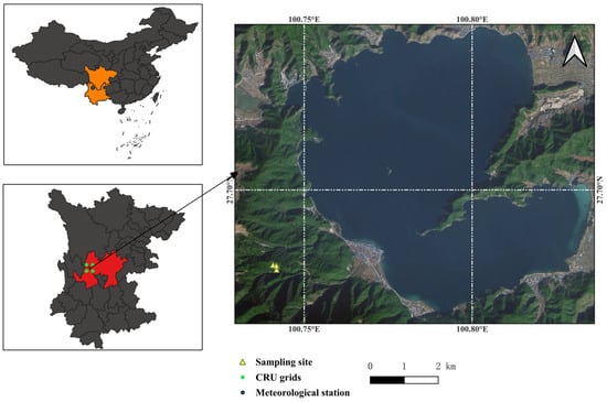 Lugu Lake Nature Reserve (100°43′–100°50′ E, 27°37′–27°45′ N) is located at the junction of the Qinghai–Tibet Plateau and the Yunnan–Guizhou Plateau []. It is within Ninglang County of Yunnan Province and within Yanyuan County of Sichuan Province, belonging to the low-latitude plateau monsoon climate zone (Figure 5). It has sufficient sunlight, warm winters, cool summers, moderate precipitation, and a small annual temperature difference. Over the past 70 years, the central region of the Hengduan Mountains has experienced a significant warming trend, with a rate of 0.3 °C per decade, while precipitation has not increased substantially, resulting in a dry-warming trend [,]. The average altitude of the Lugu Lake Nature Reserve is 2690 m, and the highest peak is 3869 m. P. yunnanensis is a principal tree species in southwestern China [] and predominantly occurs at elevations of 1500–3200 m in the study area. It exhibits a high ecological value [] and is characterized by rapid growth, strong adaptability, and tolerance to drought and barren soils []. P. armandii serves as a fast-growing timber tree in southwestern China [] and thrives at altitudes of 1600–3200 m []. It prefers cool, humid climates and deep, moist, well-drained acidic soils. This species also demonstrates cold tolerance but shows a sensitivity to aridity and high temperatures []. P. likiangensis functions as a dominant tree in the alpine forests of northwestern Yunnan, concentrating within the 2800–3500 m vertical belt []. It displays shade-, drought-, and cold-tolerant characteristics, with a shallow root system, featuring well-developed lateral roots and a preference for well-drained acidic soils []. These three conifer species are all dominant tree species in the study area.