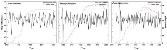 Residual chronologies and sample size of P. armandii, P. likiangensis, and P. yunnanensis tree-ring widths.