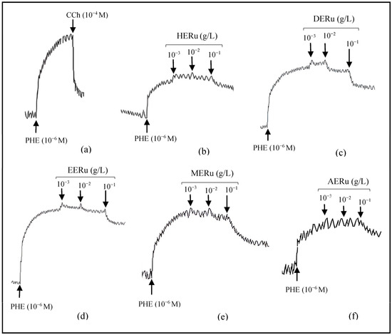 Original tracings demonstrating the vascular effects of carbachol (CCh, 10−4 M) (a) and cumulative doses (10−3, 10−2, 10−1 g/L) of crude extracts of R. ulmifolius: hexane (b), dichloromethane (c), ethyl acetate (d), methanol (e), and aqueous (f), on aorta precontracted with phenylephrine (PHE, 10−6 M).