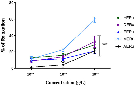 The vasorelaxant effect of cumulative doses (10−3, 10−2, 10−1 g/L) of the hexane (HERu), dichloromethane (DERu), ethyl acetate (EERu), methanol (MERu), and aqueous (AERu) extracts of R. ulmifolius on aorta precontracted with phenylephrine (PHE; 10−6 M). Results are expressed as mean ± standard error of the mean (SEM) (n = 5 rings, obtained from 5 rats per condition). *** p < 0.001 (MERu vs HERu, DERu, EERu, AERu), determined using two-way ANOVA followed by Bonferroni post hoc test.