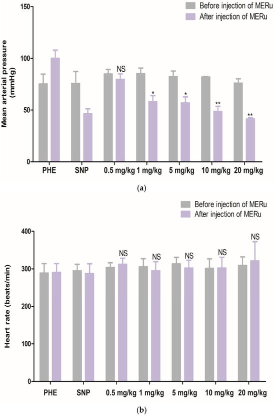 Effect of intravenous injection of the methanolic extract of R. ulmifolius (MERu) on mean arterial pressure (a) and heart rate (b) in normotensive anesthetized rats. Results are expressed as mean ± SEM (n = 3 rats) and were analyzed using two-way ANOVA followed by Bonferroni post hoc test. NS (not significant), * p < 0.05, ** p < 0.01 vs. control (before injection of the methanolic extract). PHE: phenylephrine; SNP: sodium nitroprusside.
