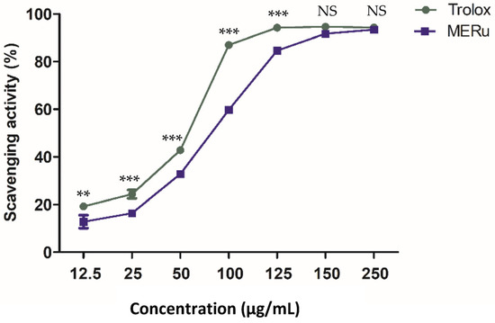 Antioxidant effect of the methanolic extract of R. ulmifolius (MERu) on DPPH radical scavenging (0.1 mM). Results are expressed as mean ± SEM (n = 3) and were analyzed using two-way ANOVA followed by Bonferroni post hoc test. NS (not significant), ** p < 0.01, *** p < 0.001 vs. Trolox.