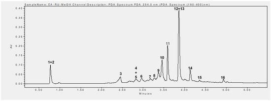 UHPLC chromatogram recorded at 254 nm. 1. Not identified, 2. rubanthrone A, 3. neochlorogenic acid, 4. p-coumaroylquinic acid derivative, 5. kaempferol-3-O-arabinoside, 6. chlorogenic acid, 7. kaempferin, 8. epicatechin, 9. 3-p-coumaroylquinic acid, 10. galloyl-bis-HHDP glucose derivative, 11. not identified, 12. ellagic acid, 13. quercetin-3-O-β-D-glucuronide, 14. kaempferol-3-O-β-D-glucuronide, 15. not identified, 16. tiliroside.