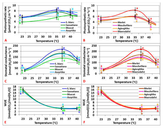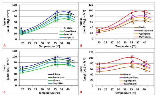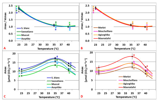 - Gallo, A.E.; Peña, J.E.P.; Prieto, J.A. Mechanisms underlying photosynthetic acclimation to high temperature are different between Vitis vinifera cv. Syrah and Grenache. Funct. Plant Biol. 2020, 48, 342–357. [Google Scholar] [CrossRef] [PubMed]