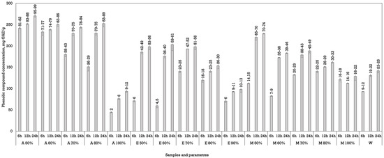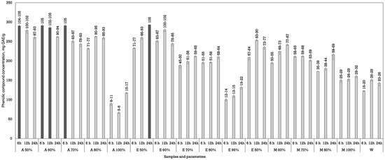 Dynamic maceration yielded different results (Figure 2). During dynamic maceration, five samples showed the highest phenolic concentration and were statistically higher than all the other samples in all of the experiments. For this method, the best results were obtained using acetone (50%) and macerating for 6 h (290.20 ± 2.83 mg GAE/g dw), acetone (60%) and macerating plant materials for 6 and 12 h (285.65 ± 3.61 and 290.95 ± 3.18 mg GAE/g dw), and using ethanol (50%) for 24 h (293.14 ± 0.07 mg GAE/g dw).