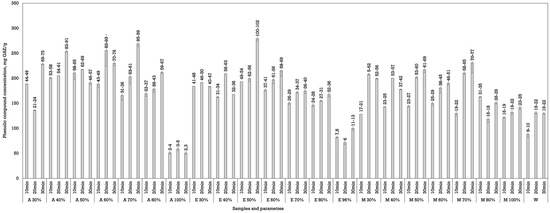 Among the solvents tested, acetone demonstrated the highest efficiency in extracting phenolic compounds using both methods of extraction. In particular, acetone at 50 to 70% concentrations achieved the highest yields (Figure 1 and Figure 2). The maximum phenolic content during conventional maceration was observed (270.70 ± 3.53 mg GAE/g dw) using acetone as a solvent at a 50% concentration after macerating the plant materials for 24 h (Figure 1).