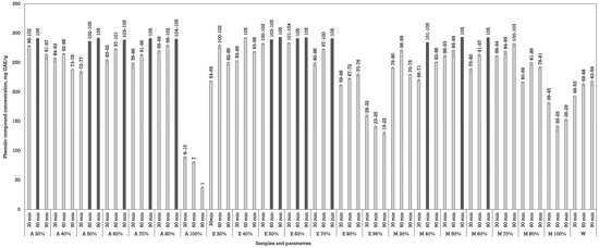 The reflux yielded the best results in this study. Few studies have employed the reflux extraction method specifically for walnut (J. regia) septa. This improved efficiency is likely due to thermal softening of plant matrices and increased solubility of bound phenolic compounds, corroborating trends observed by Zhang et al. and Galanakis et al. [21,31]. Fourteen extracts showed the highest phenolic compound content, and although their values were statistically significantly higher compared to other groups, there were no significant differences observed among these top-performing samples themselves (Figure 4).