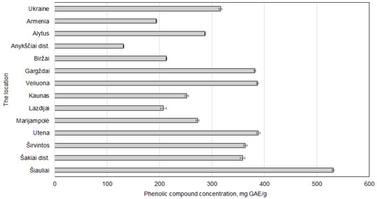Šiauliai, located in northern Lithuania, exhibits cooler average temperatures. Lower temperatures have been shown to trigger phenolic synthesis in plant tissues as a defence mechanism, as reported in other studies of various plants [4,36,37].