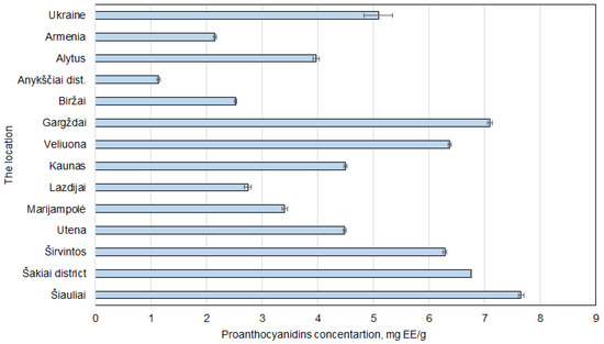 The proanthocyanidins showed similar results as phenolic compounds (Figure 6). The highest levels were detected in samples from Šiauliai and Gargždai 7.65 ± 0.05 and 7.09 ± 0.04 mg EE/g dw. Once again, the results obtained from walnut septa from Armenia and Ukraine were quite low. Nevertheless, the lowest result in all of the experiments was found in a sample collected from Anykščiai district. The concentration of proanthocyanidins was merely 1.14 ± 0.02 mg EE/g dw.