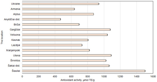 The obtained results show that the sample prepared from walnut septa collected in Šiauliai had the highest antioxidant capacity (1503.26 ± 4.61 μmol TE/g dw) (Figure 7). This result was statistically significantly higher compared to all other obtained antioxidant activity results. High values were also noted in the samples from Utena, Gargždai, and Šakiai district. The consistency between antioxidant activity and phenolic content supports the reliability of phenolics as key bioactive contributors to antioxidant capacity [40]. Conversely, walnut septa from Armenia and Ukraine exhibited notably lower antioxidant values, which may reflect differences in growing conditions, genotype, or post-harvest processing.