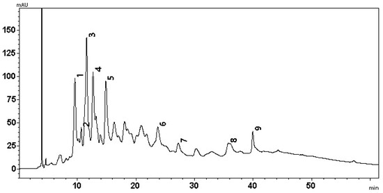Chromatographic profile of walnut septa extract samples. The wavelength used to determine the compounds was 250 nm.