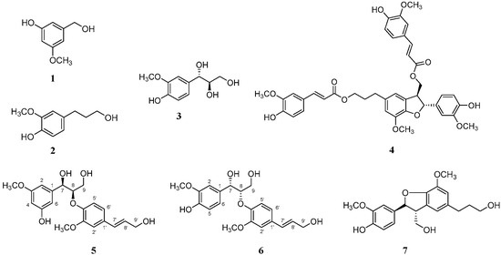 - Harmatha, J.; Lubke, H.; Rybarik, I.; Mahdalík, M. cis-Coniferyl alcohol and its glucoside from the bark of beech (Fagus silvatica L.). Chem. Commun. 1978, 43, 774–780. [Google Scholar] [CrossRef]