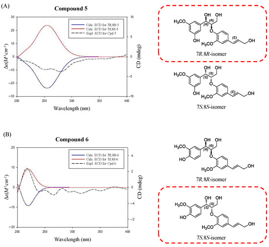 Comparison of the experimental ECD spectra of compounds 5 (A) and 6 (B) with the calculated ECD spectra of their two possible stereoisomers, (7R,8R)- and (7S,8S)-isomers.