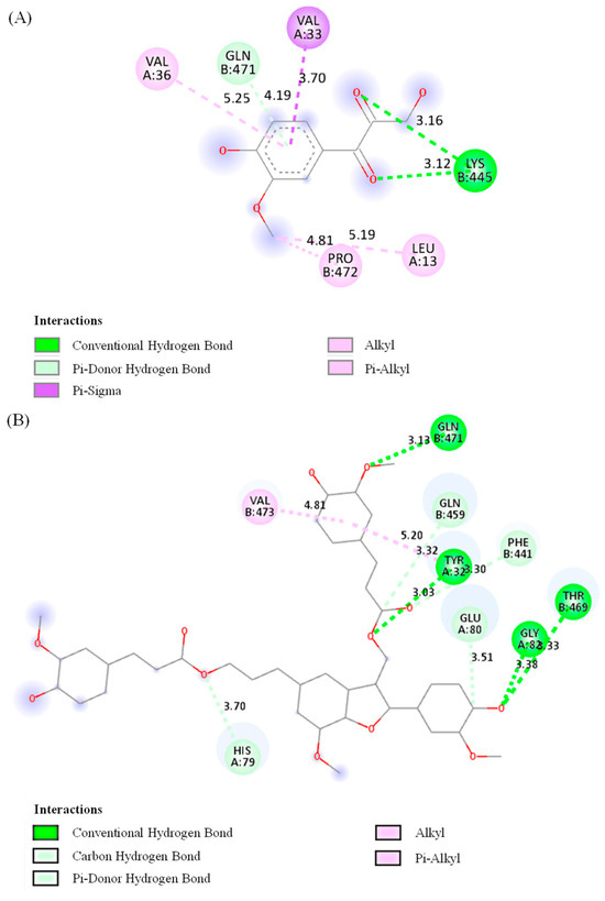 Two-dimensional interaction diagrams of two compounds 3 (A) and 4 (B) with H. pylori urease. Pink color depicts alkyl or pi–alkyl interaction. In alkyl interaction, Van der Waals forces stabilize the complex through a hydrophobic contact between the ligand and alkyl side chains (such as -CH3, -CH2– groups) of amino acid residues. The pi–alkyl interaction is a hydrophobic contact that improves ligand–receptor packing between alkyl groups and the π-electron system of an aromatic ring. Through close-range interactions, the π-system of an aromatic ring and a sigma (σ) bond interact to produce the pi–sigma interaction, shown in purple. A conventional hydrogen bond is expressed in green. It is an essential component of ligand binding specificity and affinity, and a traditional hydrogen bond involves a shared hydrogen atom between a donor (such as -OH, -NH2) and an acceptor (such as O and N). The carbon hydrogen bond depicted in light green describes the interaction between hydrogen atoms and carbon atoms (carbanions from the neighboring electronegative atoms) present in the ligand. The pi–donor hydrogen bond in light green represents a hydrogen bond in which an electronegative acceptor atom in the protein interacts with an aromatic π-system, which functions as a hydrogen bond donor.