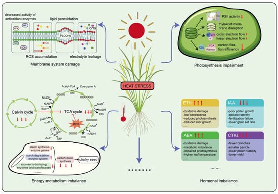 Under HS, the physiological changes in rice are primarily manifested as membrane damage, ROS accumulation, impaired photosynthesis, metabolic abnormalities, and hormone imbalances (Figure 2). These changes interact with each other, affecting the normal growth and development of rice.