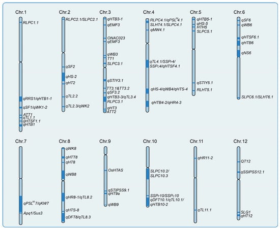 QTL (quantitative trait loci) mapping has been instrumental in elucidating the genetic basis of HS tolerance in rice, with numerous QTLs identified across all 12 chromosomes, influencing both vegetative and reproductive stages (Figure 3). Previous studies have highlighted key QTLs derived from wild rice and heat-tolerant cultivars, such as qHTH5 (304.2 kb, chromosome 5), qHTH10 (277.1 kb, chromosome 10), and qHTB1-1 (47.1 kb, chromosome 1), mapped through linkage analysis in populations from common wild rice [79,80,81]. Heat-tolerant cultivars like IR64 and N22 have been instrumental, revealing major QTLs such as qHTSF1.1 and qHTSF4.1, alongside others like rlht5.1, which affects root length under HS. Advanced populations, including chromosome segment substitution lines (CSSLs), have refined QTL mapping, identifying novel loci like qPSLht4.1 [82,83,84]. Other heat-tolerant varieties like Gan-Xiang-Nuo, Liaoyan 241 and M9962 have also been used to map heat tolerance QTLs. For example, four QTLs for heat tolerance at the flowering stage were mapped between Gan-Xiang-Nuo and the heat-sensitive variety Hua Jing Xian 74 [85]. In a cross between Liaoyan 241 and IAPAR-9, eleven heat-tolerance QTLs were identified, with four major QTLs (qNS1, qNS4, qNS6, qRRS1) showing stable detection across environments and interactions with other genes [86,87]. Using QTL-seq, QTLs for spikelet fertility (qSF1, qSF2, qSF3) were found on chromosomes 1, 2, and 3 in the F2 population of M9962 and Sinlek [87].