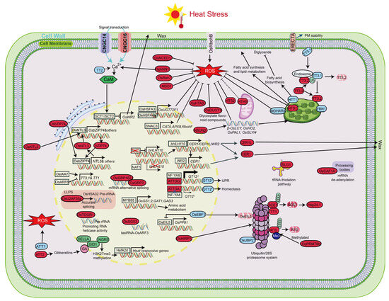 In addition, HS stimulates the excessive production of ROS within rice cells. Excess ROS cause widespread and severe damage to cellular components. One major consequence is lipid peroxidation of the cell membrane, in which ROS oxidize membrane lipids and exacerbate membrane damage. This oxidative stress leads to increased levels of malondialdehyde (MDA), a key marker of lipid peroxidation, and impairs the normal function of proteins and nucleic acids. In severe cases, ROS accumulation can trigger programmed cell death (PCD), further compromising plant cell viability under HS [24,25]. Furthermore, HS also compromises the activity of antioxidant enzymes, particularly superoxide dismutase (SOD) and catalase (CAT), which play vital roles in scavenging ROS and maintaining cellular redox balance. The decline in these enzymatic activities under high temperature conditions further exacerbates oxidative damage, contributing to increased cellular injury and dysfunction [26,27].